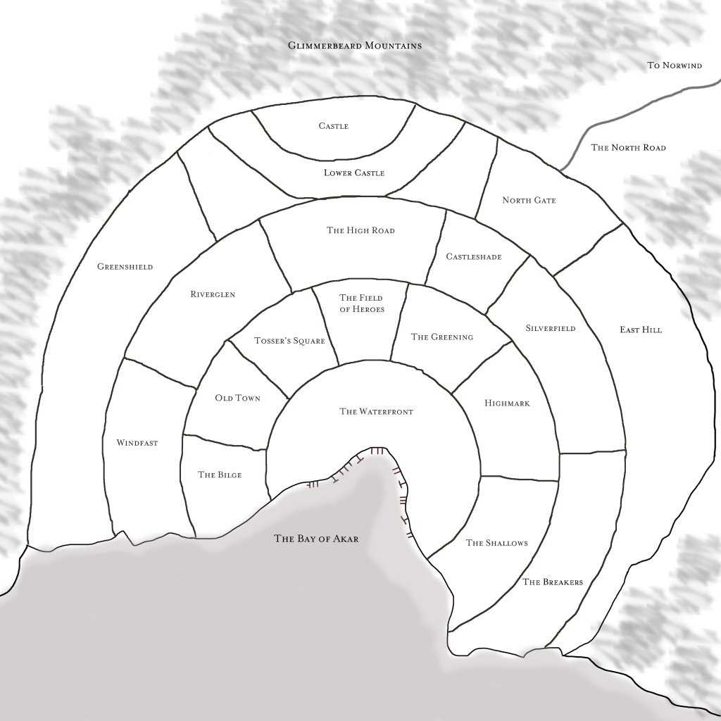 Sanctuary is divided into several regions which arrange themselves in concentric half-moon rings beginning closest to the port and expanding toward the island’s interior. The city’s wealth tends to concentrate in the Third and Fourth Rings which are higher and further inland, and are far from the crime, poverty, and disease that run rampant in The Waterfront district in the First Ring. The Second Ring with its markets and merchants, academies, guild halls, and middle-class residences acts as a buffer between established wealth of the nobles and clergy uphill and the destitution and misfortune of those trapped at the water’s edge.